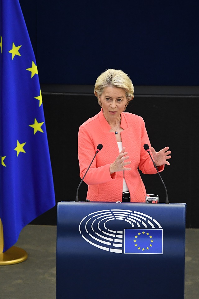 La Presidenta de la Comisión Europea, Ursula von der Leyen, durante su intervención...