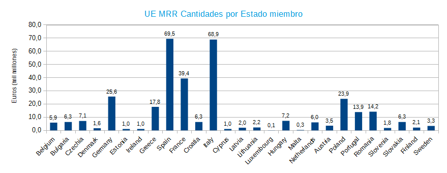 Las cantidades asignadas a cada Estado miembro como subvenciones con cargo al MRR se han calculado teniendo en cuenta su población, PIB per cápita, la tasa media de desempleo durante los últimos cinco años en comparación con la media UE y el descenso real del PIB provocado por la pandemia en el período 2020-2021. Los importes son los que aparecen en la siguiente tabla: